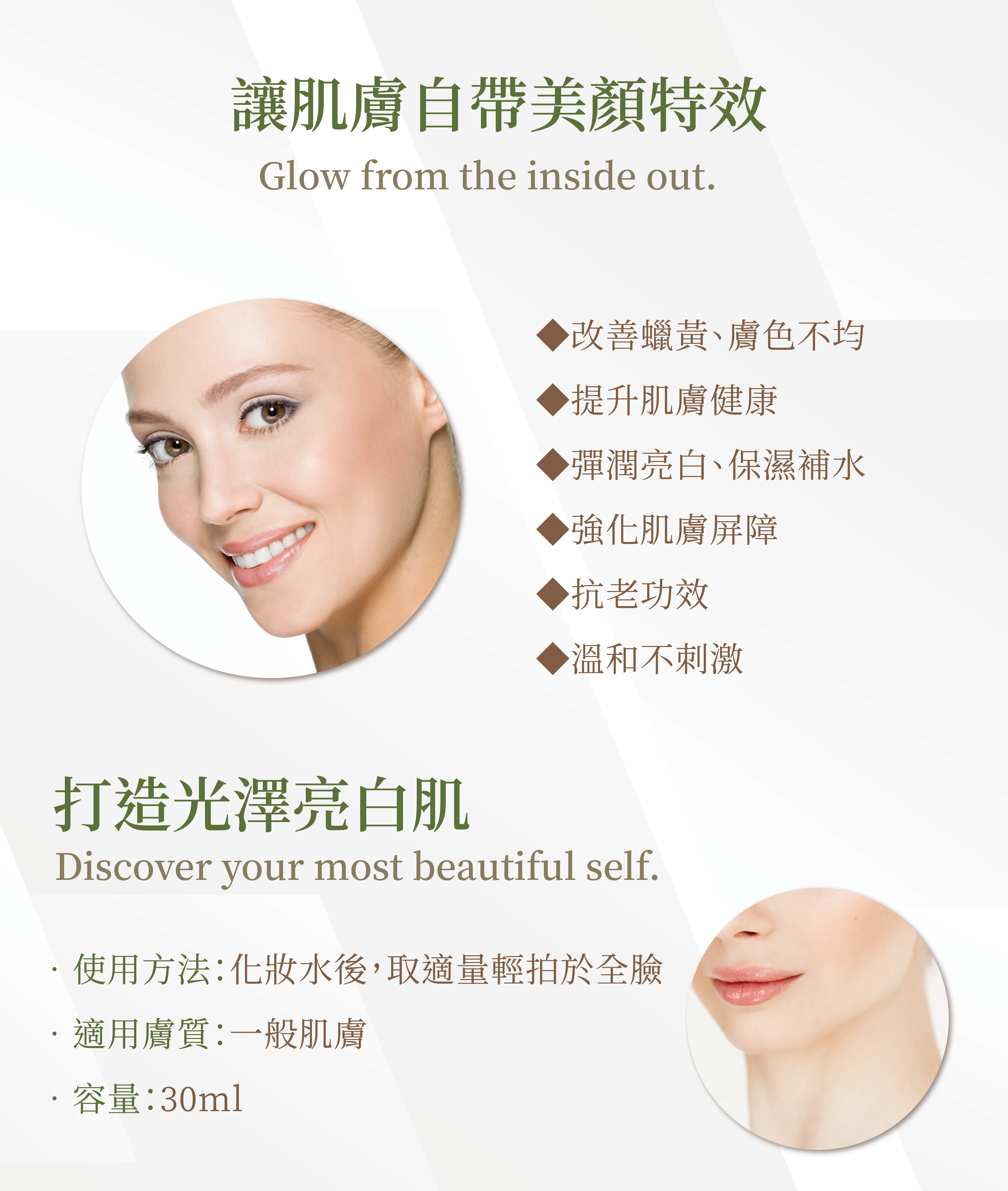 乳化型態精華,幫助珍貴成分滲透並滋潤肌底,均勻膚色、提升肌膚健康透亮白皙