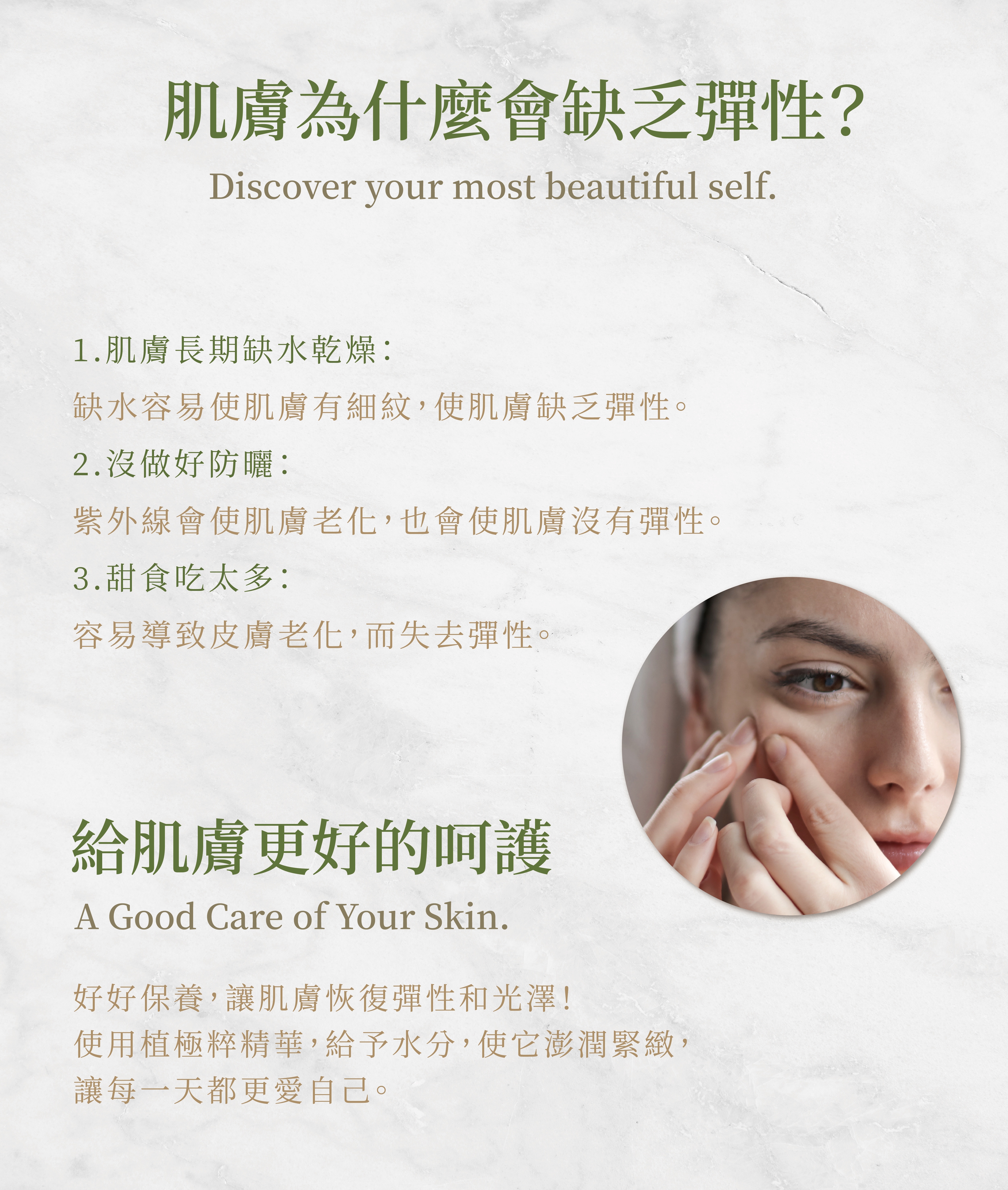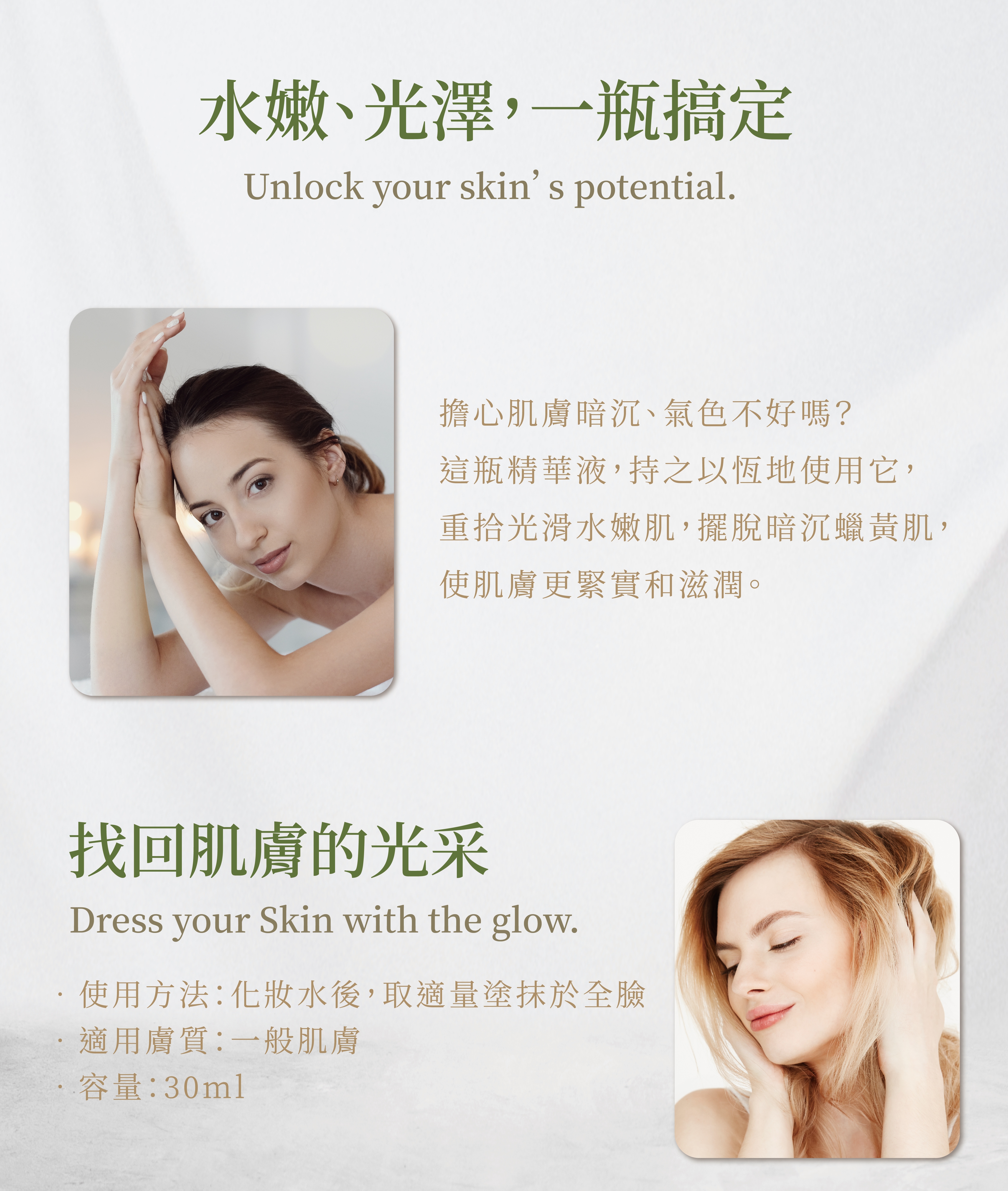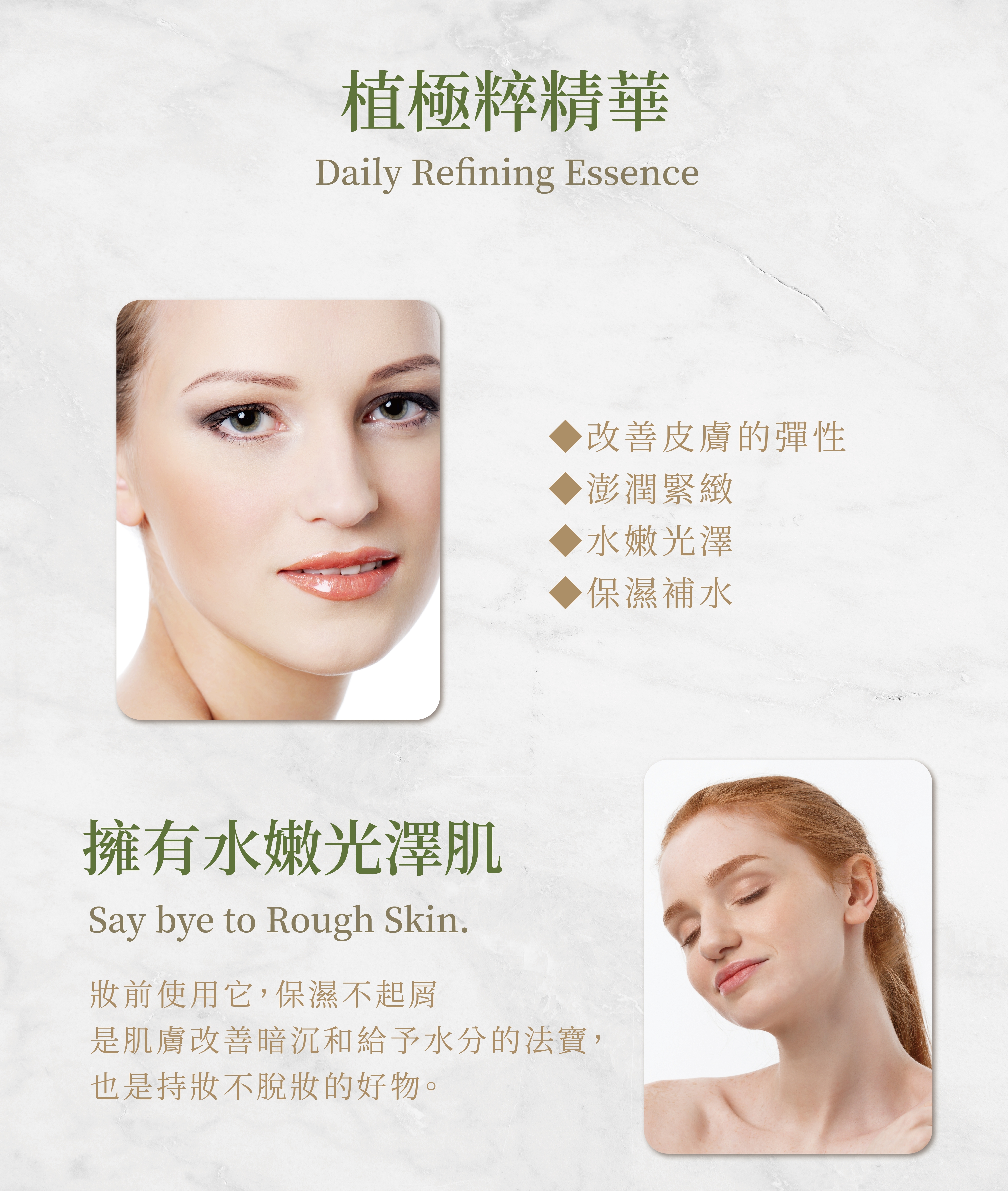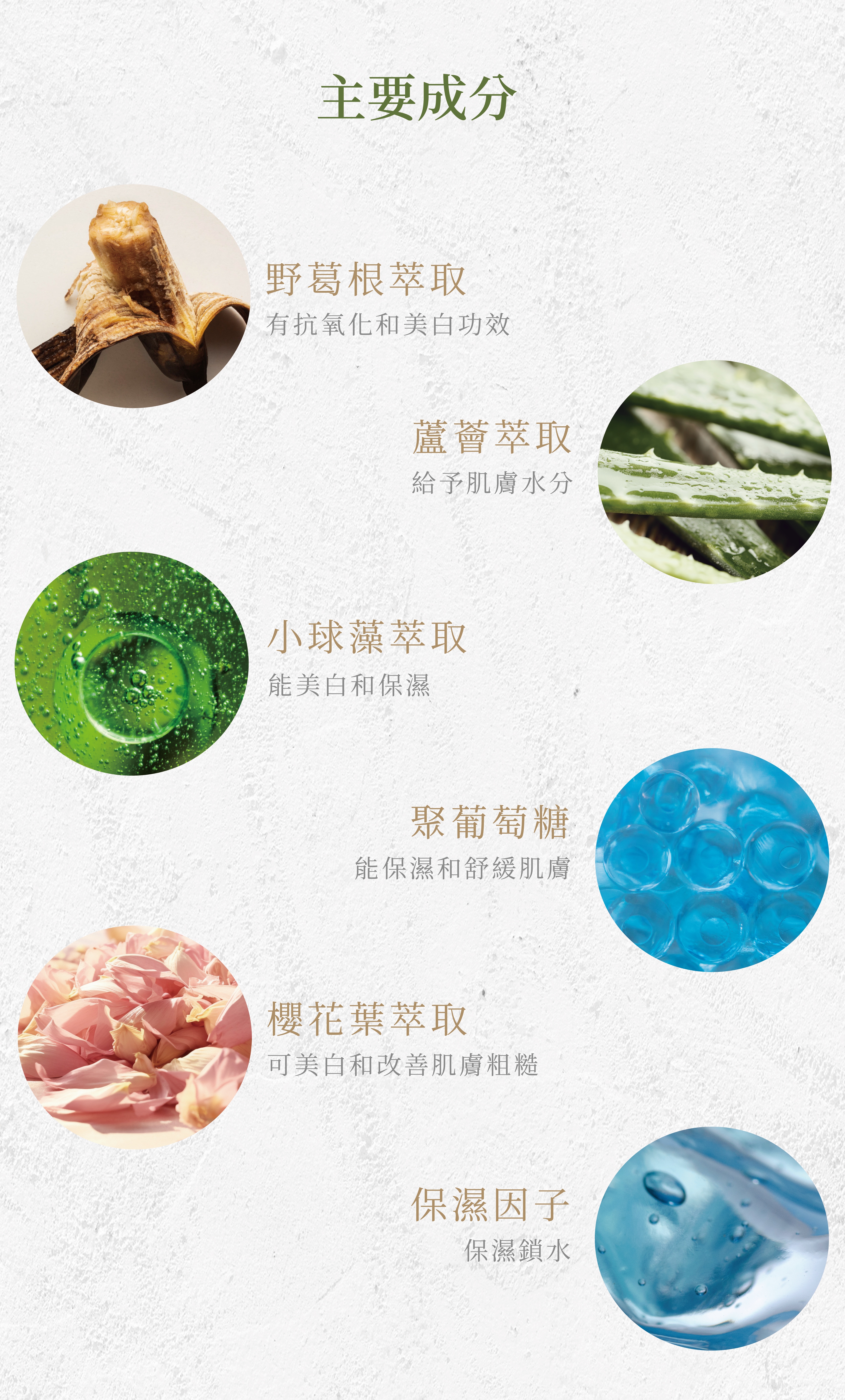 含有葛根、庫拉索蘆薈和小球藻的複合植物萃取物,有助於改善皮膚的彈性及水含量,使肌膚澎潤緊緻,水嫩有光澤