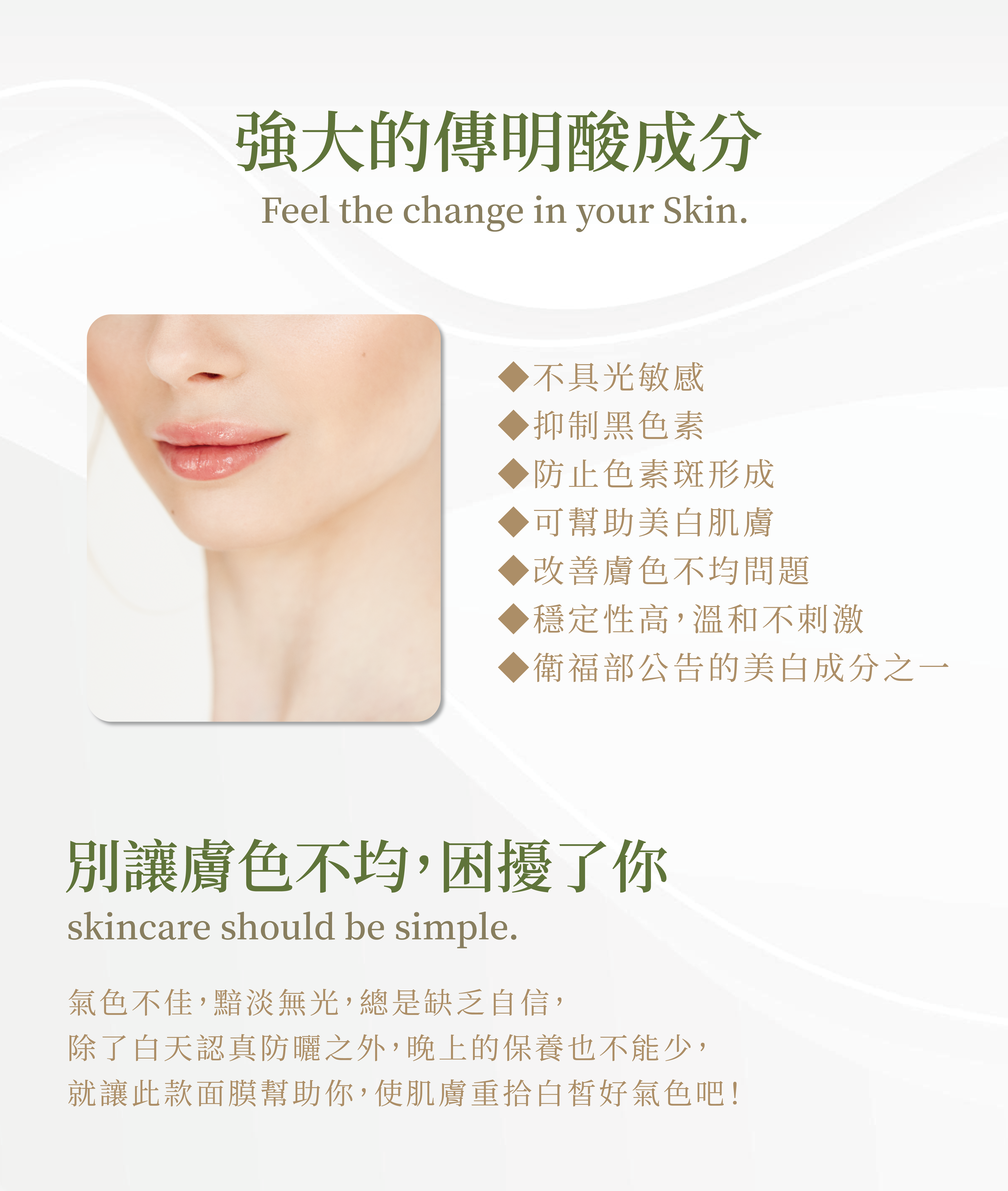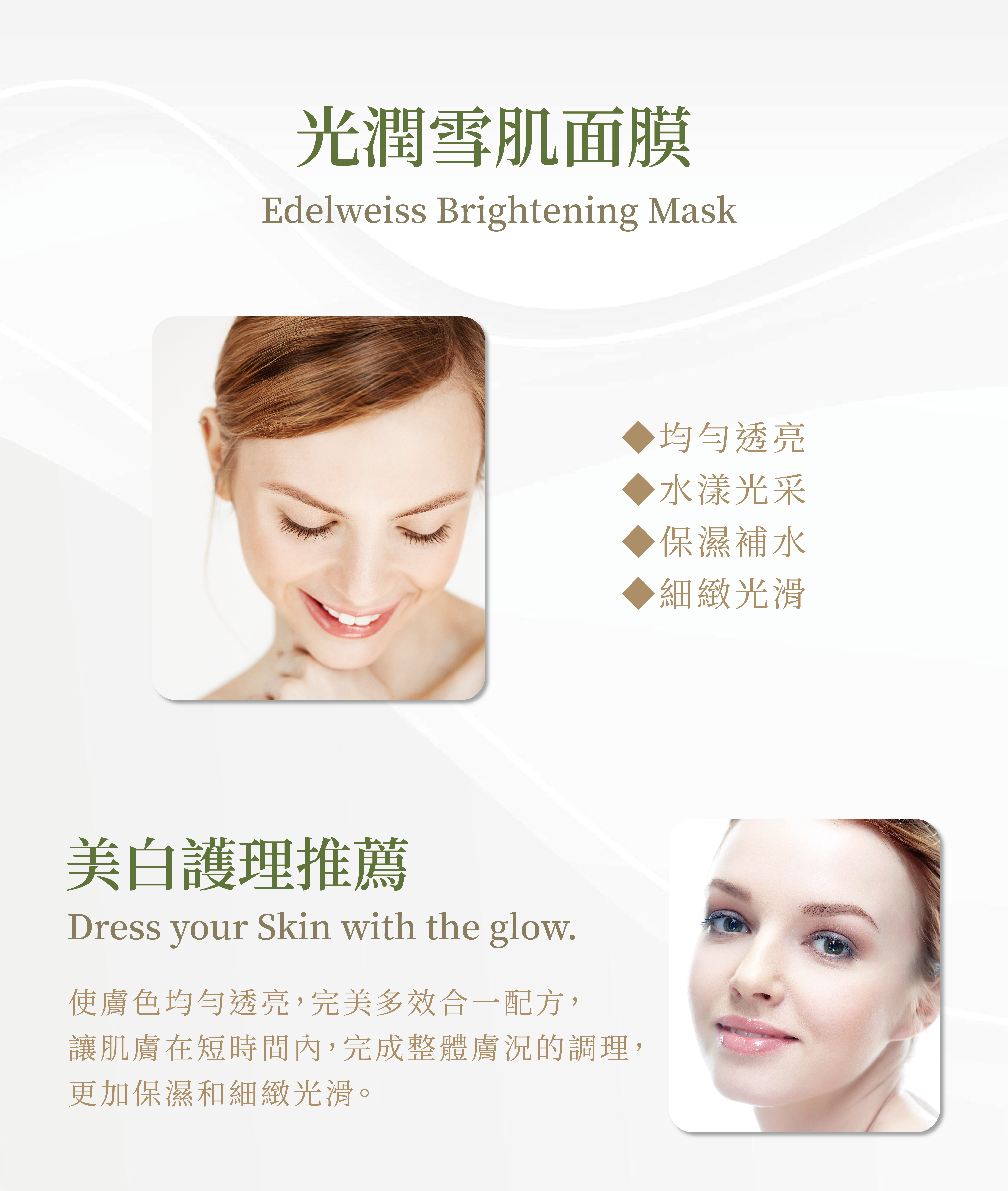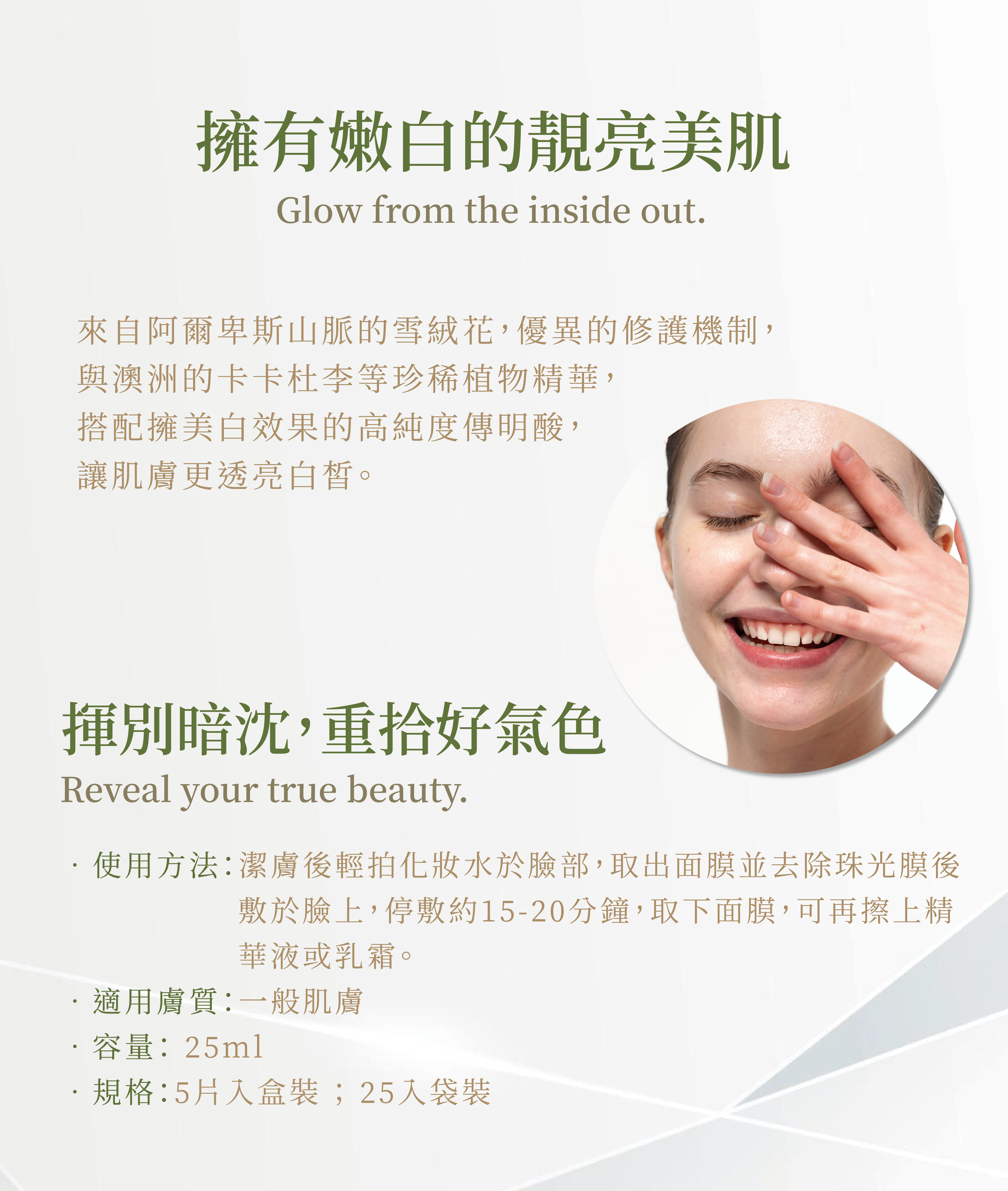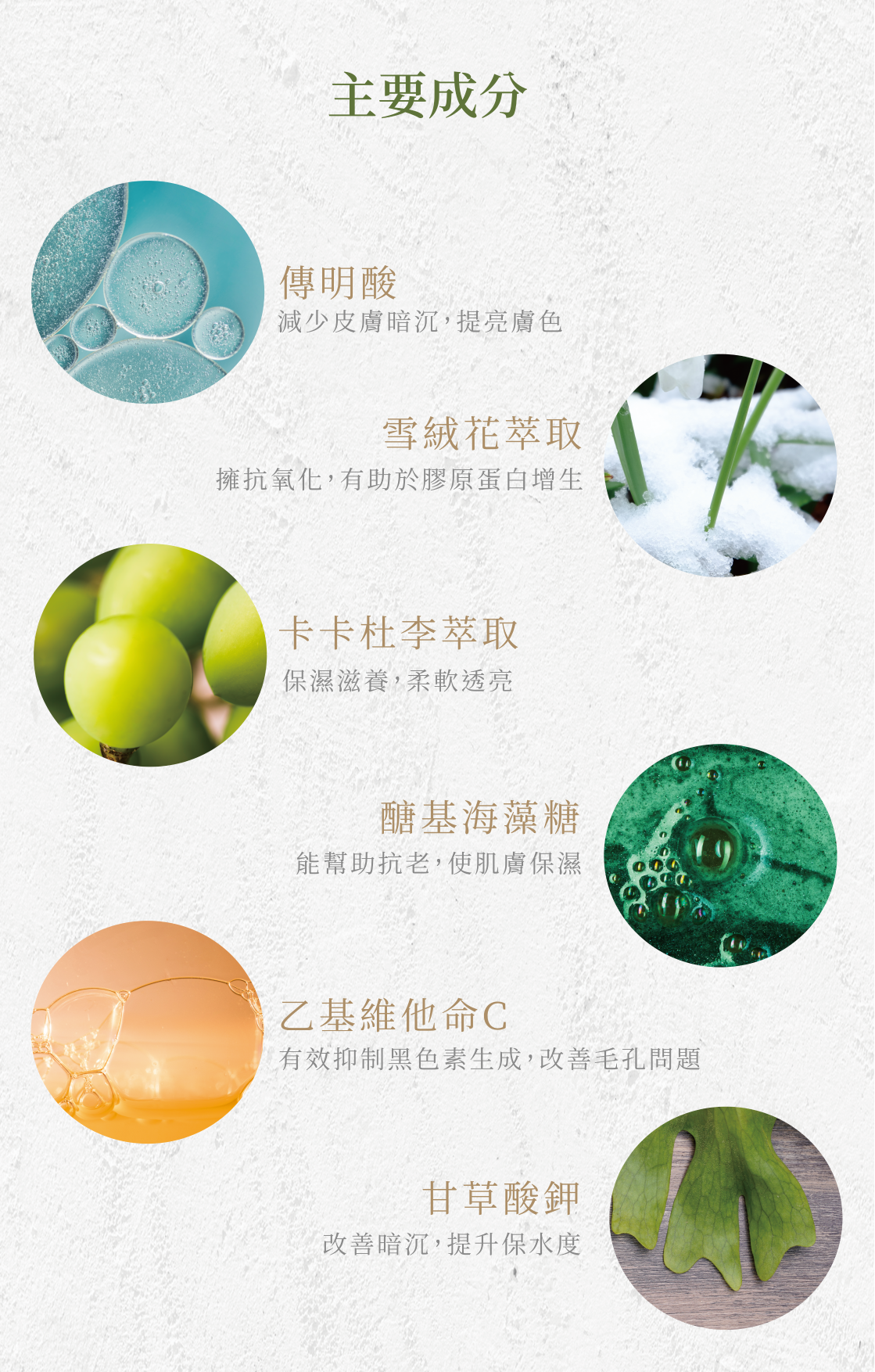 來自阿爾卑斯山脈的雪絨花,與澳洲的卡卡杜李等珍稀植物精華,搭配高純度傳明酸,組合出淨白保濕滋潤,完美多效合一配方,使膚色均勻透亮更添光彩。