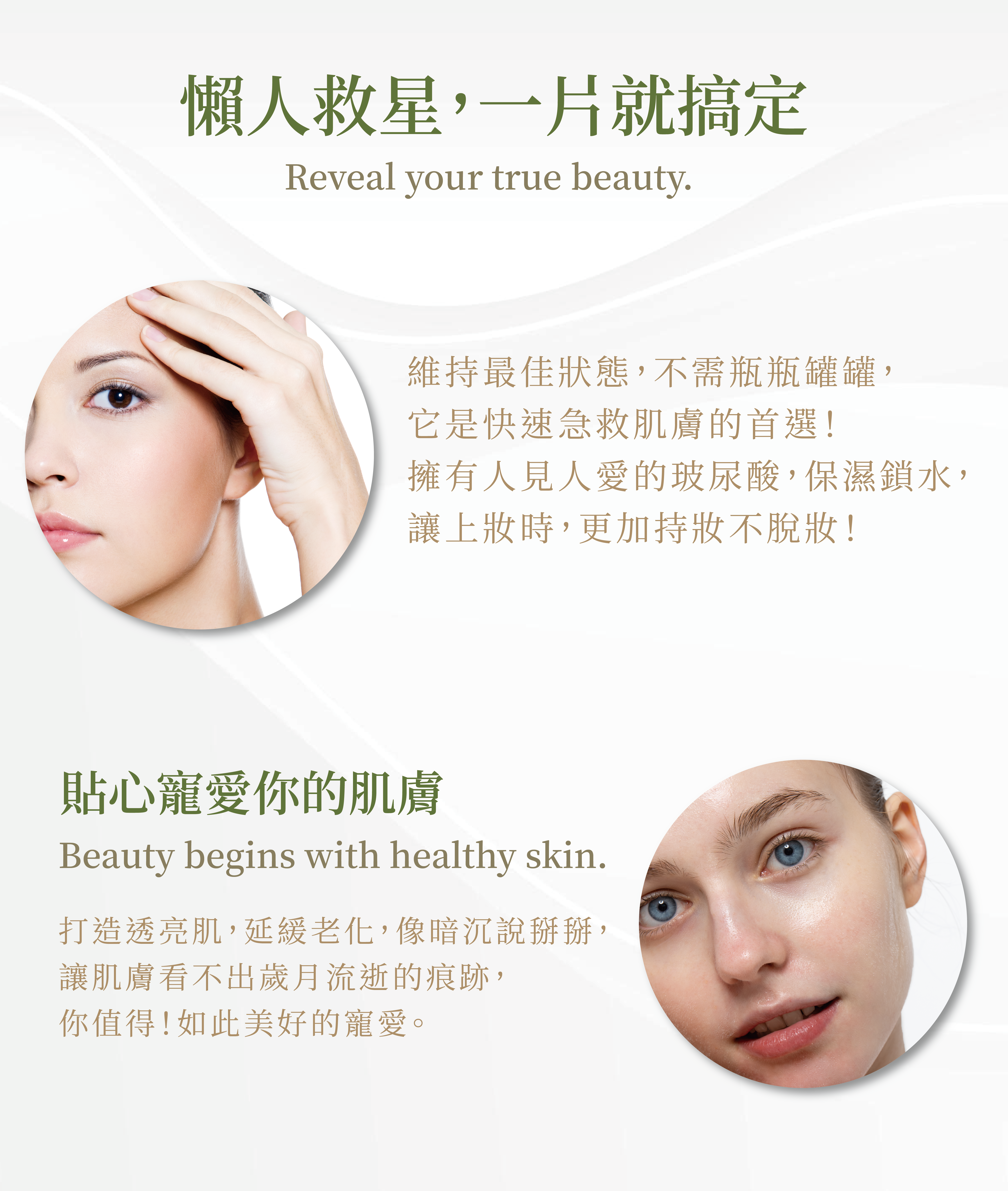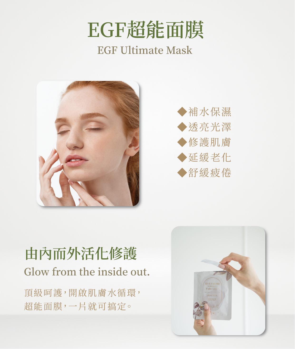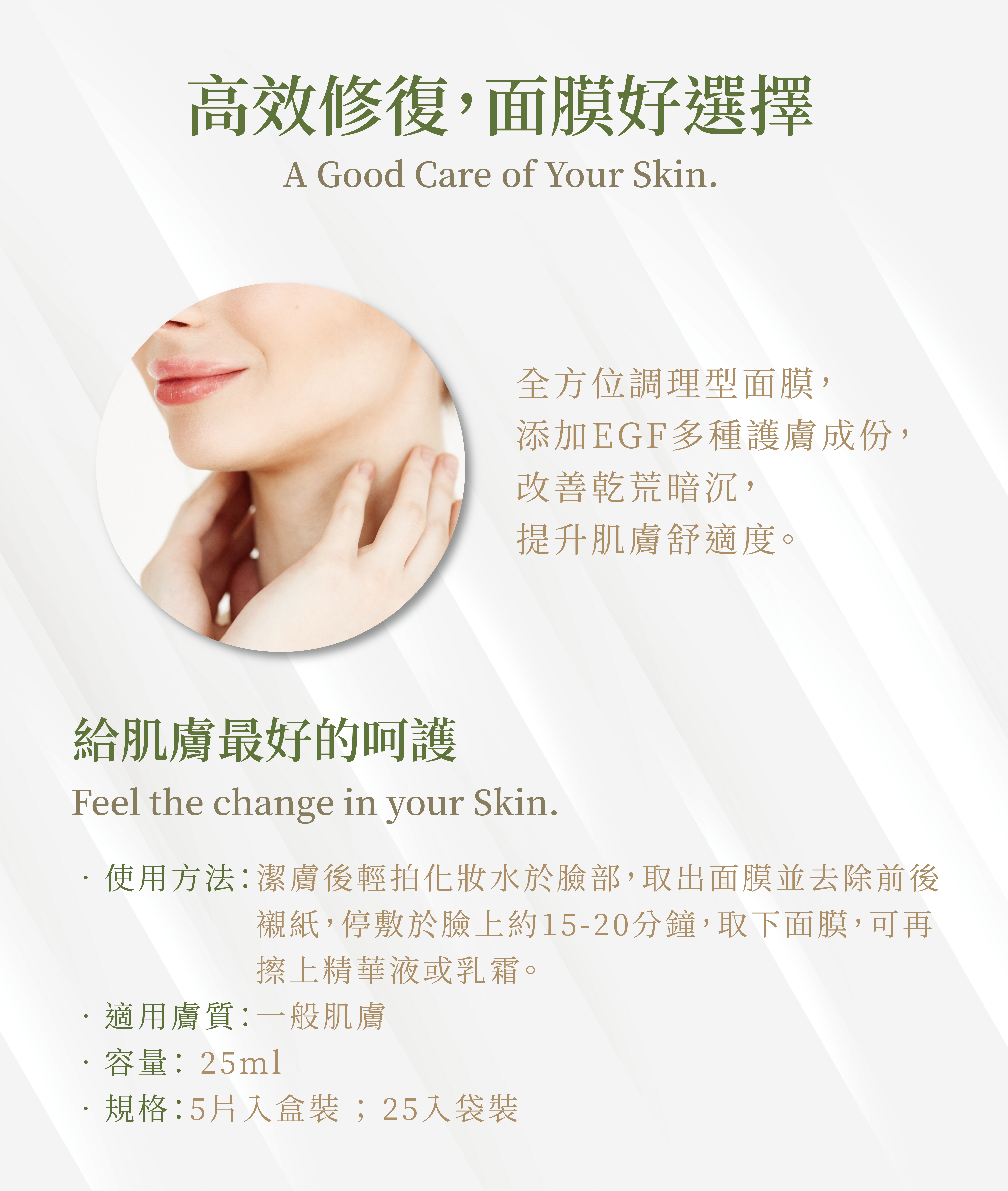 全方位調理型面膜,添加EGF、胜肽、玻尿酸等多種護膚成份,改善乾荒暗沉,提升肌膚舒適度、修護肌膚、延緩肌膚老化、亮白、補水及舒緩疲倦的肌膚,使皮膚呈現透亮光澤。
