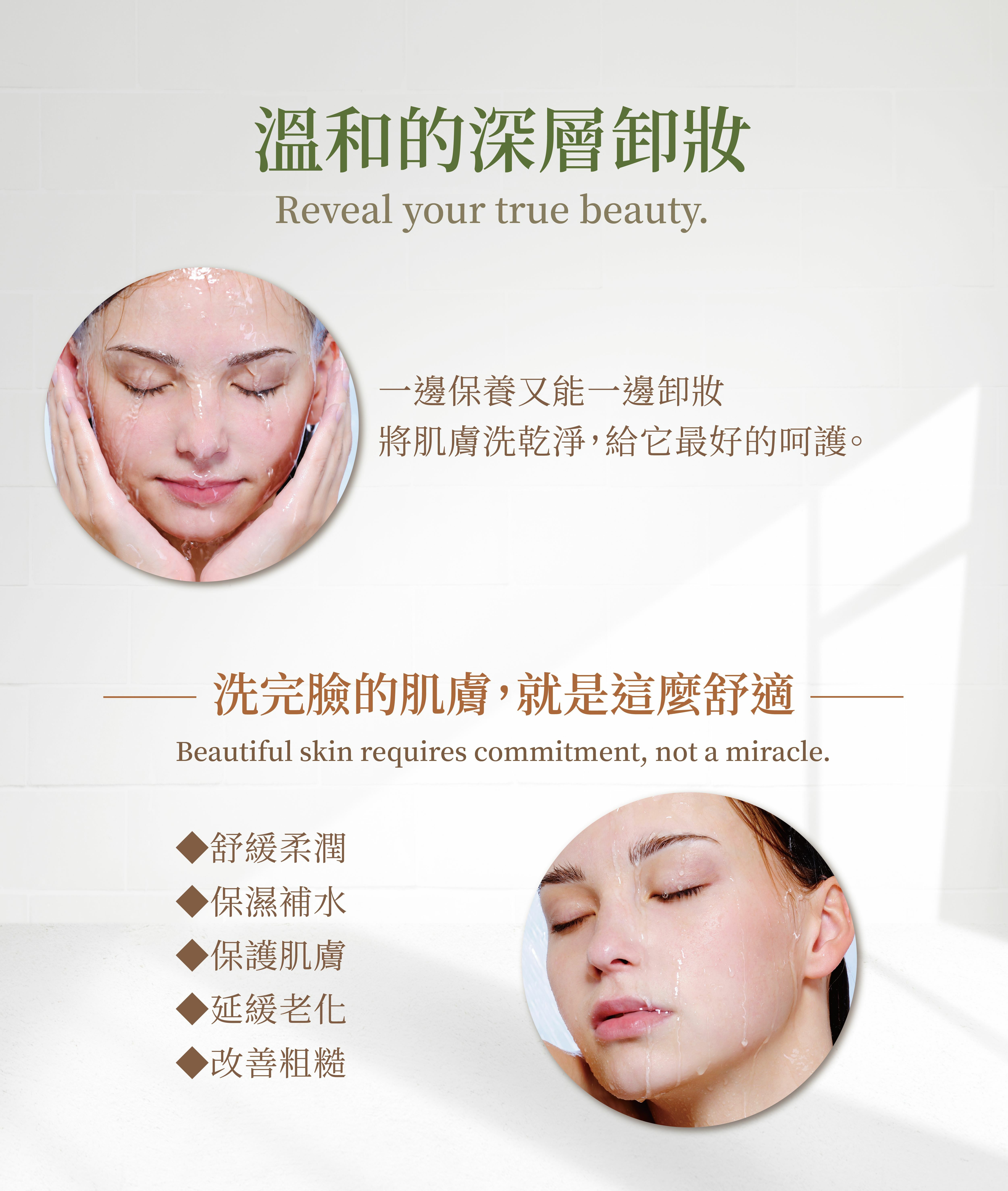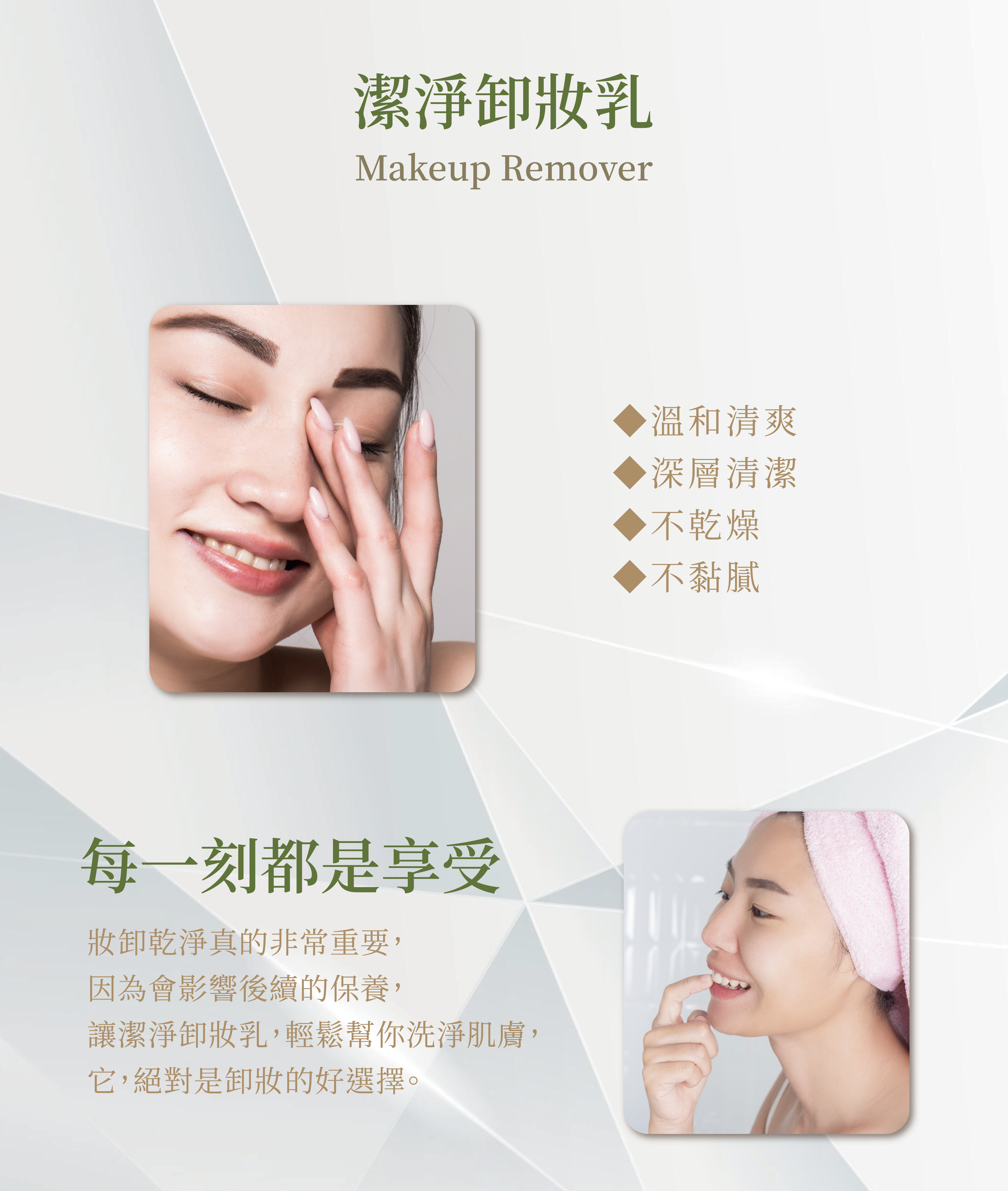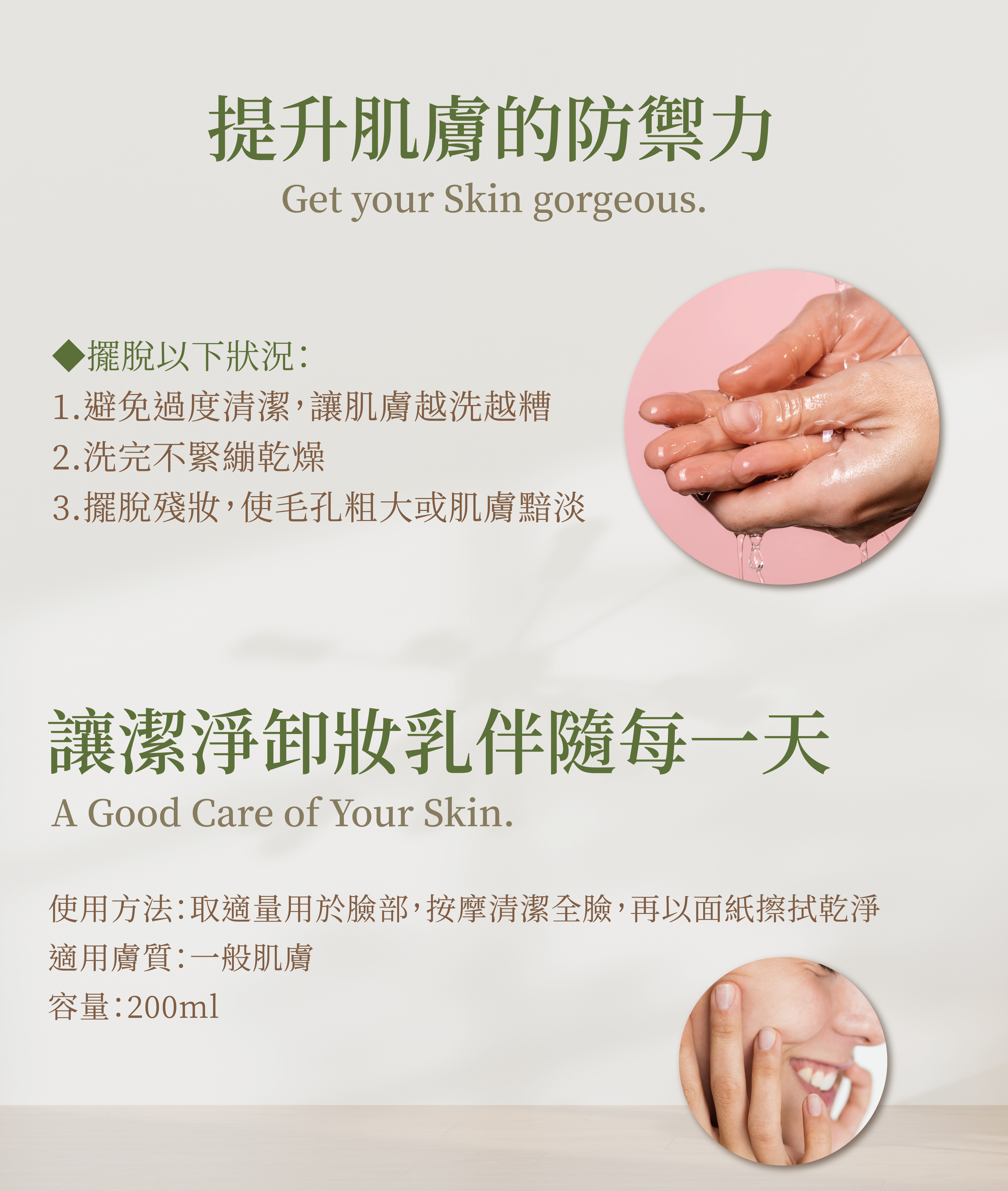 不黏膩、好沖洗、不致粉刺外,更不需過度摩擦肌膚,就能有效卸淨臉部彩妝及髒汙!