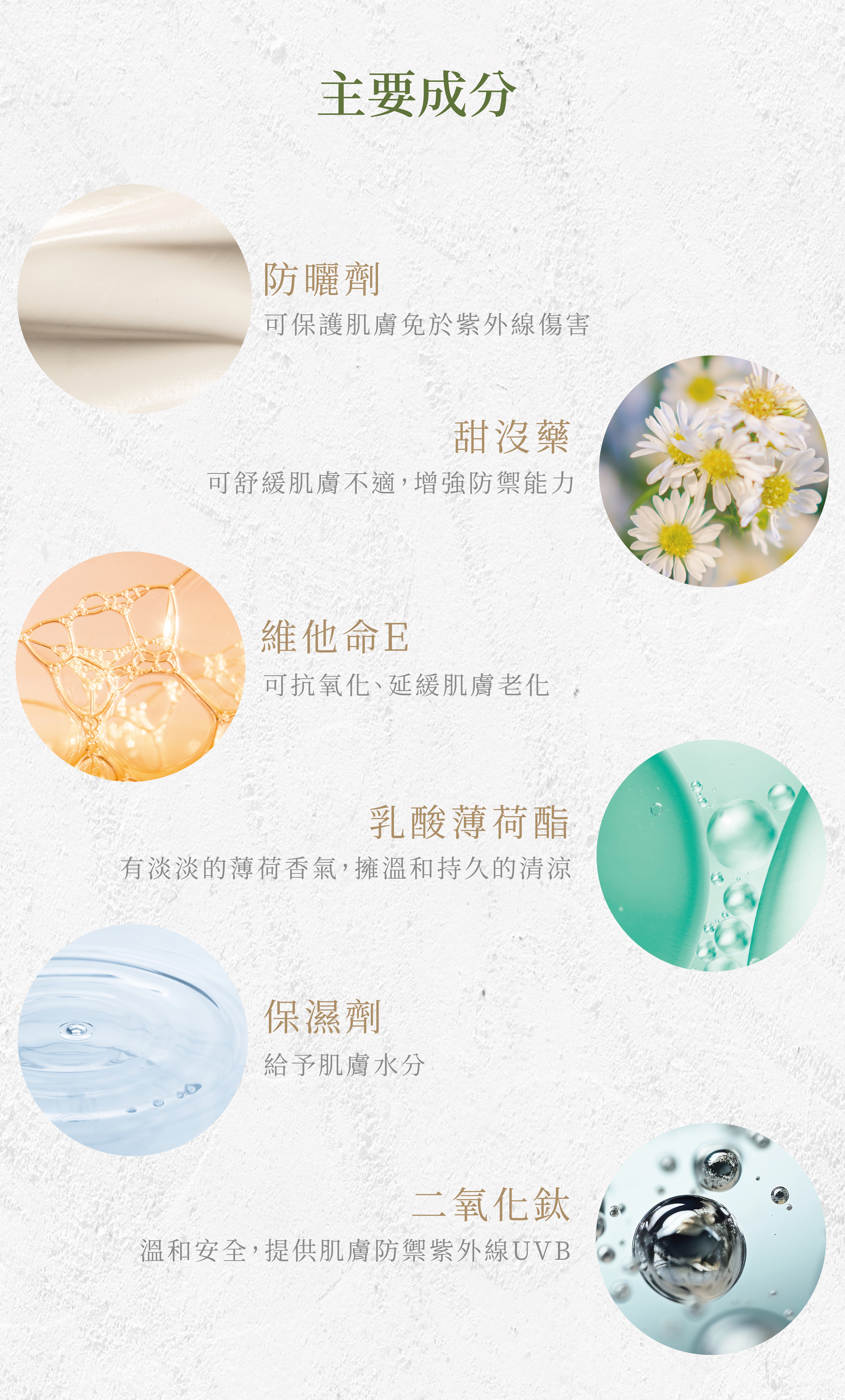 •主成分:防曬劑,甜沒藥,維他命E,乳酸薄荷酯,保濕劑,二氧化鈦