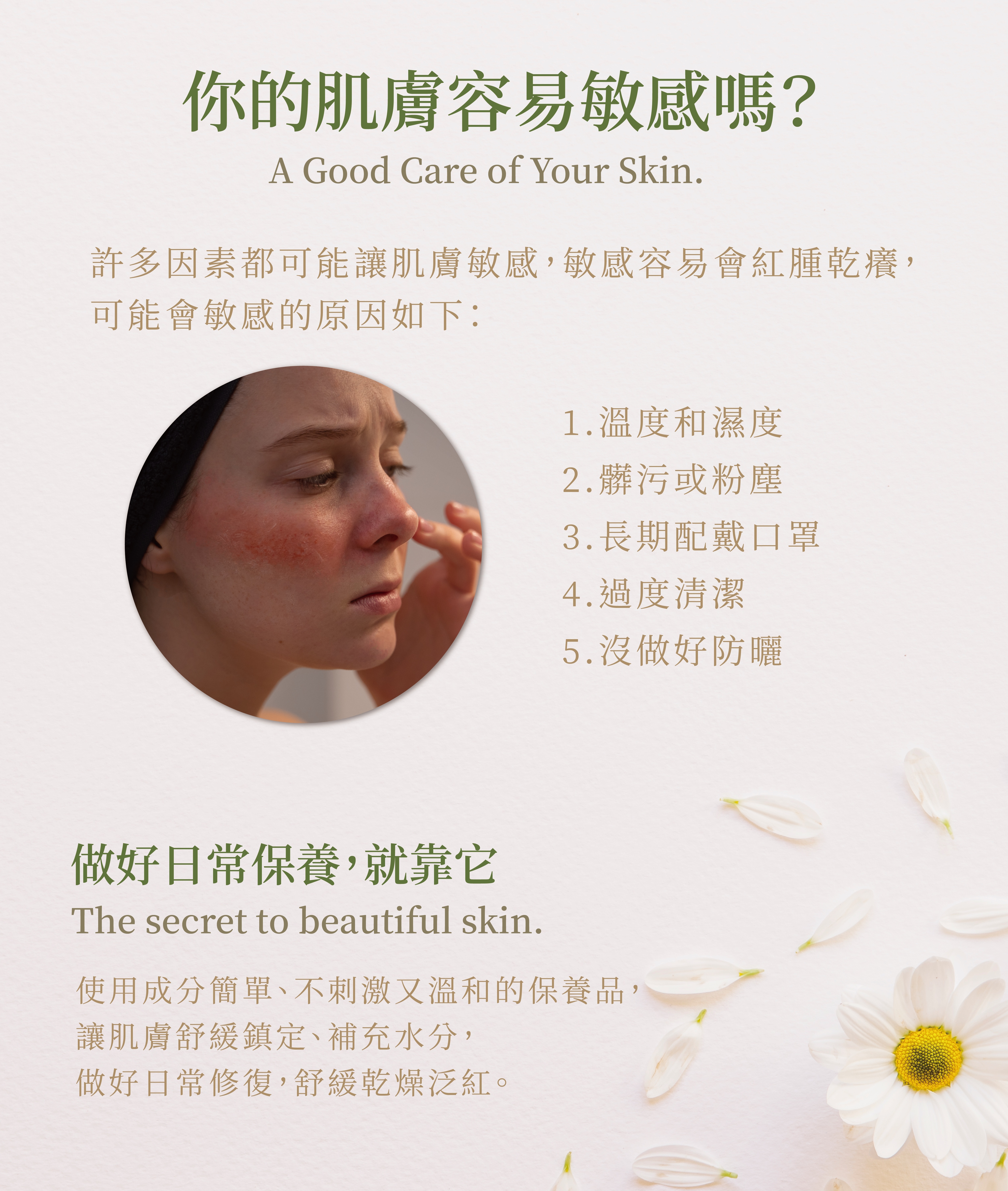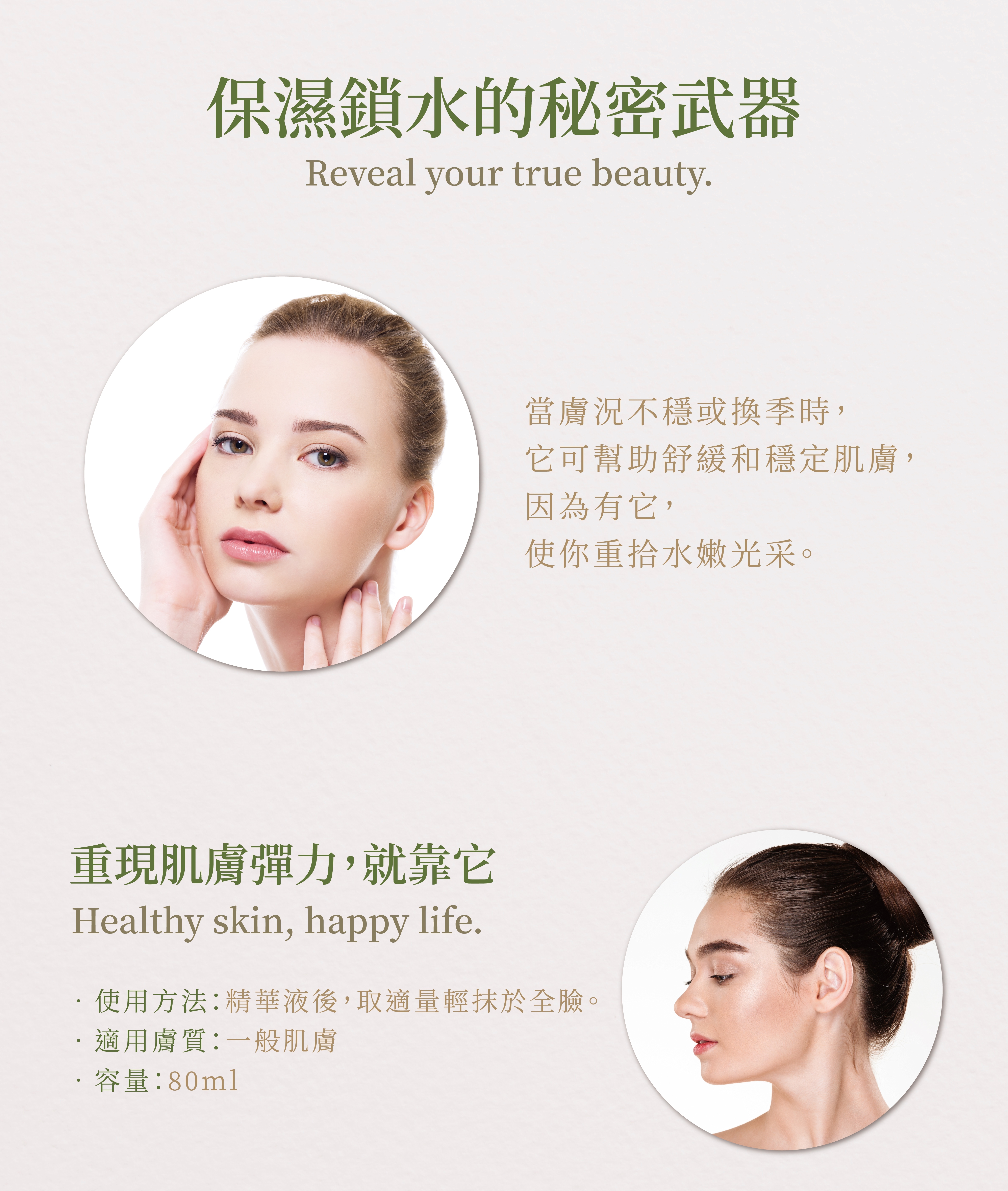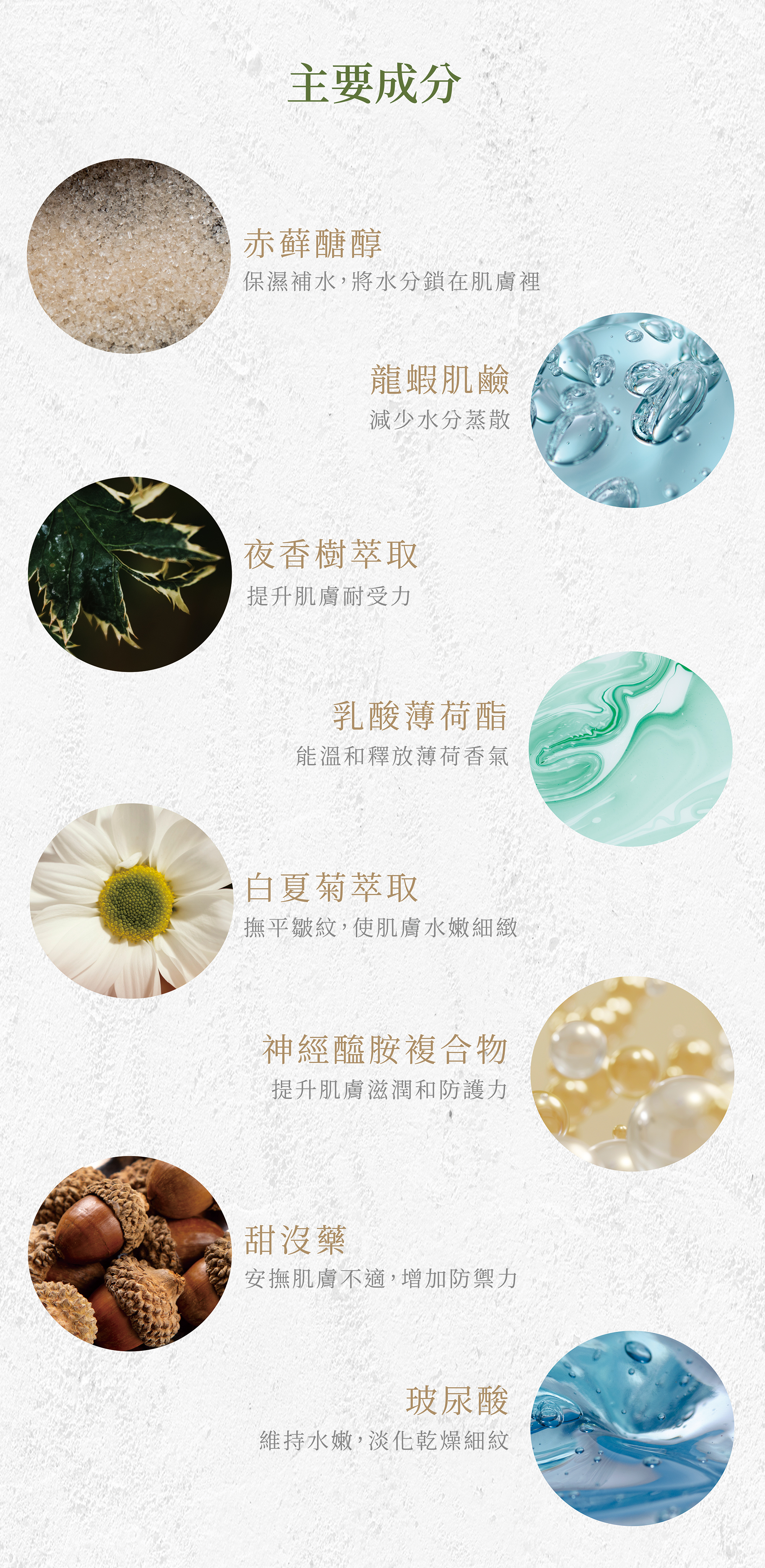 添加神經醯胺複合物、玻尿酸及白夏菊萃取,給予肌膚保濕及舒緩效果,沁涼清爽的質感,使肌膚感到舒適